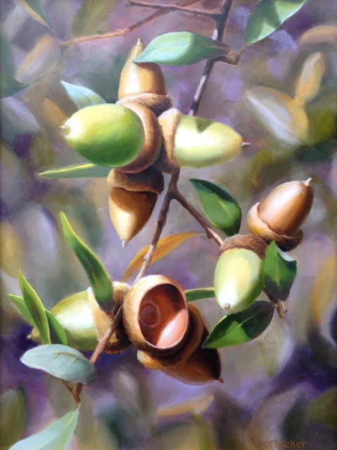 What better subject for the new year than the acorn! Beginnings, possibilities, great things to come... All the rich potential for a majestic oak is contained it the beautiful nut that wears a cap! All the birds that will find homes in the oak's branches, the squirrels that will store it's nuts for winter, all the deer, coyote and bobcat that will pause in it's shade in the hot summer, and all the oxygen the oak will release into the air is in that beautiful nut that fits so perfectly in the palm of your hand. Magic!