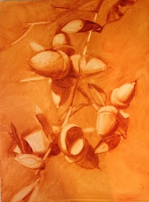 This is a photo of the underpainting. Done in Burnt Sienna, this is how I place my image on the panel, develop the pattern of values and make sure I like the composition.