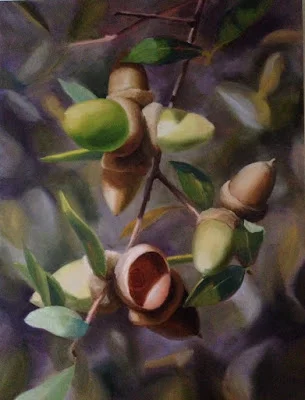 Here I have spent several sessions on the acorns and leaves in the foreground. Several more are required to finish the detail of the subject, and to balance it with the background.